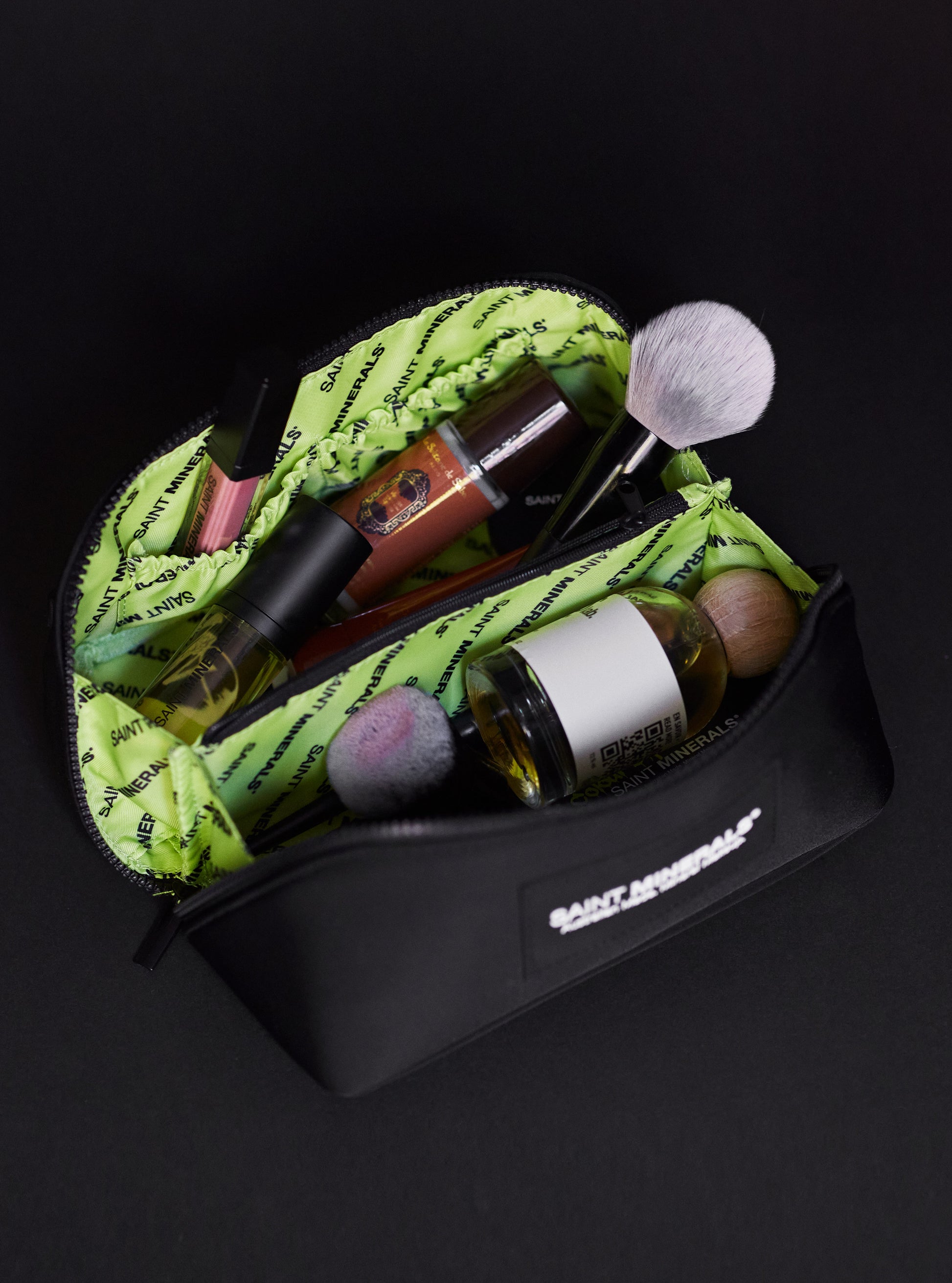 Denne makeup taske er holdbar, vaskbare og er fremstillet af førsteklasses sort neopren med et friskt neongrønt nylonfor.